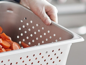 Due to its perforated bottom and sides, this item permits fluids to drain away from your food, reducing the risk of cross-contamination caused by unnecessary handling. This stylish and efficient pan features round, tapered corners for easy scooping and pouring of foods or liquids.