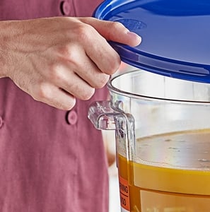 This container also features bold blue-colored graduations in quarts and liters to make measuring easier when portioning out ingredients or prepared food. These easy-to-read graduations help your staff identify amounts at a glance to make it simple to take inventory or assess how much product you have remaining. The graduations' blue color matches the included lid to help you create a color coding system in your busy kitchen!